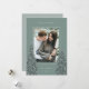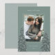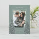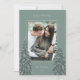 Um design de cartão de Natal moderno e elegante, com uma fotografia vertical solteiro em um fundo verde sábio. Dois pinheiros altos armam sua foto, pontilhados com neve branca. Personalize com seu cartões de natal personalizado, seu nome de família e o ano.