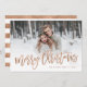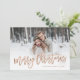 Barato Cartões de foto de Natal impressos personalizados com modelos simples para personalização. Este design na moda moderno apresenta um falso roteiro de folha de ouro rosa Merry Christmas typografia sobreposta na sua foto de sangria de cheio. Personalize-o com suas fotos, nome da família, ano ou outro texto personalizado. Observe que a folha falsa faz parte da design impressa - as cartas não têm folha metálica real. O lado inverso tem um padrão de fita de folha de alumínio inversa ou use o espaço para fotos e texto adicionais. Use as ferramentas de design para alterar as fontes de texto e as cores, adicionar mais fotos e criar uma única design de Cartões de foto de Natal.