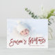 cartões com fotos de feriado personalizados com barato simples para personalização. Este design na moda moderno apresenta a tipografia de saudações de Season, gravada em vermelho, sobreposta na sua fotografia de sangria de cheio. Personalize-o com suas fotos, nome da família, ano ou outro texto personalizado. Observe que a folha falsa faz parte da design impressa - as cartas não têm folha metálica real. O lado inverso tem um padrão de fita de folha de alumínio inversa ou use o espaço para fotos e texto adicionais. Use as ferramentas de design para alterar as fontes e cores do texto, adicionar mais fotos e criar uma única design de cartão com fotos de feriado.