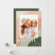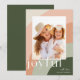 Um design de cartão de feriado chic e elegante com uma foto vertical ou orientada para o retrato de solteiro em um único layout arquivado, enquadrado por formas de faixa orgânica em tons suaves de pêssego, argila, verde-sábio e verde-caçador. "Joyful" aparece por baixo da sua foto em um tipo subestimado, com o ano na dentro da letra "o" na parte superior esquerda, com o nome da sua família na parte inferior direita. Personalize com seu nome de família no canto inferior direito para o toque final perfeito para estes cartões com fotos de Natal 2021 inspirados na natureza.