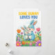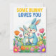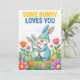 Sweet Easter greeting card featuring an affectionate parent and baby bunny illustration surrounded by spring flowers and decorated Easter eggs. The message “Some Bunny Loves You” makes this card ideal for parents, grandparents, and family members sharing a warm Easter sentiment with a child or loved one. Soft pastel colors and playful characters give it broad appeal for Easter and spring gifting.