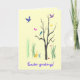 This Easter card creates a colorful, whimsical spring mood. Birds are flying and are perched in the tree. Butterflies hover in the warm air. A duck waddles in the grass. There is even a tiny snail on the ground. The image is repeated inside. All text can be customized to suit your needs.