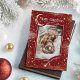 Espalhe a alegria de férias com este cartão mágico de "Feliz Natal". Este design vermelho e dourado capta um céu noturno encantador, enfeitado com estrelas pequenas e grandes que definem o palco perfeito para a foto da sua família. Uma lua crescente e estrela cadente elegantemente enquadra seu momento, fazer brilhar como um milagre de Natal. Com uma mistura perfeita de elegância moderna e charme vintage, este cartão é ideal para mostrar a sua família, criança, bebê, animal de estimação ou celebrá-lo como um casal ("Feliz e casado")