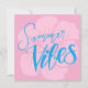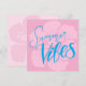 Bright summer postcard featuring handlettered “Summer Vibes” in vibrant blue on a soft pink background with a faded hibiscus flower. Perfect for sending cheerful greetings, vacation notes, or tropical vibes.
