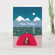 Este cartão de Natal para os campistas tem uma tenda vermelha com montanhas com capas de neve no fundo e uma lua de cheio no céu estrelado. Há um lago com ondulações, e a porta da tenda tem um estoque de Natal verde e branco.