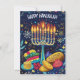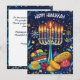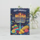 Celebre o Festival das Luzes com este cartão de saudação encantador "Hanukkah Radiance". A frente mostra uma menorah lindamente ilustrada com velas brilhantes, contra um céu azul profundo cheio de estrelas cintilantes e fogos de artifício festivos. Ao redor da menorah estão símbolos tradicionais como sonhos, moedas de gelt e suganítes, somando-se à atmosfera alegre. Ramos de oliveiras e folhas levemente cascata, simbolizando a paz e adicionando um toque orgânico à cena. A frase "FELIZ HANUKKAH!" aparece de forma destacada no topo, convidando os destinatários para o espírito de feriado. As opções de texto personalizáveis permitem um toque pessoal, fazer cada placa especial.