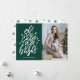 Elegante, cartão com fotos de férias moderno, com a frase "Tudo é calmo, tudo é brilhante" em um roteiro branco, com letras de mão, com sotaques de estrelas contra fundo verde. Personalize a parte frontal do cartão de feriado manuscrito, adicionando seu nome e sua foto favorita. A carta se inverte para um padrão de flocos de neve verde e branco de starburst.