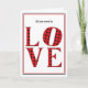 Tudo o que você precisa é AMOR, uma palavra de quatro letras escrita em uma fonte serif art déco xadrez preto e vermelho de búfalo para o Dia dos Namorados. Uma abordagem sofisticada de um padrão xadrez rústico de lenhador vermelho e preto. O texto interno diz, Tudo o que eu preciso é você. O texto da frente e de dentro pode ser personalizado com sua própria mensagem de coração.