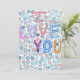 Este trabalho de arte colorido soletra "EU AMO VOCÊ" em letras ousadas, desenhadas à mão, cheias de intrincados motivos cardíacos. Cada letra tem uma cor única — vermelha, roxa, azul e laranja — adicionando vibração à peça. O fundo consiste em um padrão de alveolado de hexágonos, cada um cheio de designs distintos e criativos, como espirais, flores e formas geométricas em cor-de-rosa suave, cinzas e tons azuis.