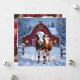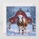 Um lindo cartão de Natal com uma ilustração de uma vaca festiva usando um chapéu de Papai Noel em frente a um lindo celeiro vermelho decorado com luzes de Natal e uma grinalda festiva em um dia de inverno nevado. Você pode adicionar seu próprio cumprimento de Natal personalizado, nome e endereço na área de personalização.