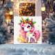 Envie desejos mágicos de férias com este cartão de unicórnio temático dourado. Com uma coroa de azevinho, juba cintilante e expressão alegre, é a escolha perfeita para saudações alegres.