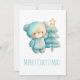 Um cartão de Natal plano com uma ilustração adorável. Um urso aconchegante com estrelas e faíscas no pelo. Ao lado de uma árvore de Natal. Cor azul-esverdeada do Pastel. Whimsical e fofo.