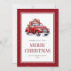 Watercolor Merry Christmas card com um velho carregando vermelho presente no Natal. Personalize facilmente este cartão de Natal de caminhão vermelho nevado com o seu nome familiar e o ano.