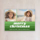 Frente - 2 Fotos com saudação em fonte retrô e fundo com faixas vibrantes. Design de Natal não convencional com uma vibração de 70 anos. Back - Arte Retro Line em Sombras de Verde Natal - Use duas fotos e faça uma saudação de Natal Única e moderna com uma fonte retrô na frente e um padrão de arte festiva no fundo. Se precisar mover alguma coisa, clique no botão personalizar para fazer alterações.