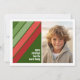 Modelo de fotografia frontal do Solteiro em uma grade simples com uma borda branca. Um padrão divertido e retrô de faixa com vermelhos e verdes e uma simples fonte fazem um design moderno e mínimo para a temporada de férias. Traseiro - Padrão verde profundo e vermelho de faixa retrorativa com vibração de 70 para o feriado. Se precisar mover alguma coisa, clique no botão personalizar para fazer alterações.