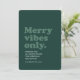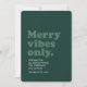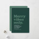 A feliz vibe apenas nesta temporada de festas! Envie um cartão de feriado retrô com este design divertido e divertido. O tipo de retorno lê "somente vibrações de feliz" em verde em uma imagem verde mais escura e também tem espaço para uma mensagem, nome e ano personalizados. A parte de trás da coordenação tem uma textura angustiada para completar o olhar da safra.