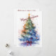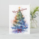 A festive watercolor Christmas tree adorned with vibrant ornaments and topped with a glowing golden star. Splashes of color and a bold red bow at the base add artistic charm to this joyful holiday scene. The reverse side features a heartfelt seasonal message and the sender’s name, printed for a personal touch.
