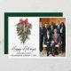 Modern Elegant Calligraphy Ink Script Watercolor Pines Winter Greenery with Burgundy Red Ribbon Bow Christmas Ornaments, Pine Cones and Holly Berries Company Photo Happy Holidays Card - Green