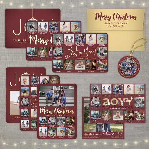 What a year to remember! Send stylish joyful greetings and share 18 favorite pictures with a 5x7 photo collage holiday card. Create your own unique year in review card for family and friends to enjoy. All pictures and wording on this template are simple to personalize. The colors and font styles can be customized with the Zazzle Design Editor tool. The burgundy red, gold and white design features trendy casual handwritten script, elegant classic typography name and year, and a modern photo grid with 18 square pictures and typewriter font captions. The message on back is easy to personalize or delete. Family and friends will love displaying this stylish customized card. Please note that the gold is printed color, not metallic foil. Happy Holidays!