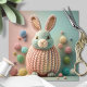A soft, playful, cuddly knitted bunny in pastel colors with tiny yarn eggs, perfect for Easter greeting cards and spring holiday decor. The design is charming and plush, with a handmade feel and bright, warm, friendly appeal.