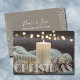 Linda vela branca, ornamentos e cobertores jogam na frente deste cartão de cartões de natal plano com Feliz Natal em letra chica e sua saudação personalizada nas costas. Selecione Matte para o papel mais pesado e alta definição para melhor qualidade de impressão.