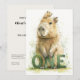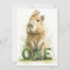 This sweet first birthday invitation features a watercolor capybara holding green “ONE” letters, painted in a soft woodland style. The back includes matching watercolor details with space for your party information. A gentle and charming design for nature-inspired celebrations.
