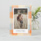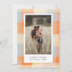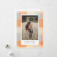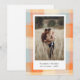 Um design de cartão de Natal festivo elegante e rústico com um fundo xadrez aquarela colorido em tons de Laranja Creme Azul Claro com espaço para uma foto pessoal (orientação vertical ou retrato).