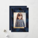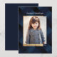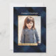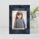 Deseje aos seus amigos e família um feliz feriado com o nosso elegante e festivo padrão de xadrez de búfalo com marinho de cor d'água e cartão de fotos de solteiro destacado com folha de ouro. Design apresenta o design de padrão de xadrez de marinho de aquarela pintada manualmente com sotaques elegantes de fotos douradas. layout de foto do solteiro para exibir sua foto especial da família. Personalize com um cartões de natal, assinatura familiar e ano. Trabalho de arte por Moodthology Papery.