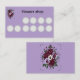 Valorisez votre boutique avec cette carte de fidélité au format rectangulaire classique (8,9 cm x 5,1 cm). Le design élégant met en avant un bouquet de roses bordeaux sur un fond violet délicat, idéal pour les fleuristes et boutiques artisanales. Elle dispose de 10 cases pour tampons afin de récompenser la fidélité de vos clients avec style.