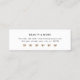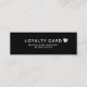 Cartão Simples Elegante de Lealdade Coração. Recompense seus clientes leais com este Cartão Simples Elegante de Lealdade Cardíaca - perfeito para pequenas empresas, salões, spas, compradas de café e boutiques. Projetado em um formato mini elegante (3,0" x 1,0"), este cartão de fidelidade apresenta 5 pontos, com uma recompensa concedida na visita de 6 (por exemplo, desconto, produto gratuito ou serviço especial). Um ícone cardíaco minimalista e uma fonte elegante dão a esta carta uma aparência moderna e na moda. Disponível em 4 opções de cores quic para corresponder ao seu mini tamanho do Compacto de marca - fácil de carregar e armazenar Personalizável: adicione seu nome comercial, informações de contato ou Excelente de oferta especial para retenção de clientes e reconhecimento de marcas