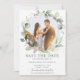 Destaque sua foto pré-casamento com este cartão de foto para salvar a data do casamento boho chic. Com uma bela coroa de folhagem de água verde em aquarela. Personalize-o com seus detalhes de forma fácil e rápida, basta pressionar o botão personalizar para reorganizar e formatar o estilo e a colocação do texto.