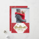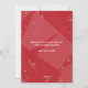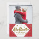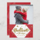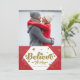 Para casais noivos ou recém-casados. Envie este cartão de Natal com foto com padrão geométrico vermelho para amigos e familiares. Acredite na Magia em fonte de letra dourada com um padrão de confetes de estrelas douradas. Desenho de Elke Clarke © Outras cores disponíveis mediante solicitação.