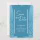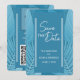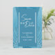 Folhas tropicais fazem um apelo moderno e cativante para esses cartões de aviso de casamento. Apresenta tons de cor azul-teal. Use para complementar temas de casamento tropicais e eventos especiais usando azul-teal como cor focal. O verso do cartão acomoda uma foto. Há também um código QR que você pode usar para o seu site de casamento, RSVP, lista de casamento (entre outros). Use o modelo para personalizar.