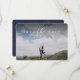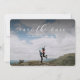 Com uma tipografia simples, mas elegante, este cartão de salvar a data é um design clássico que apresenta uma única foto horizontal. O texto em branco é colocado na parte superior da foto junto com um filtro escurecedor para permitir uma melhor legibilidade. A parte de trás é um azul marinho salpicado, mas a cor é editável clicando em "personalizar".