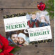 O design do cartão de Natal com 2 fotos da TeeLofts apresenta uma tipografia moderna e ousada 'Merry & Bright' e um 'e' comercial cinza claro sobreposto sobre os elementos do design. O design é acentuado com arte de linha de verduras de Natal em verde e dourado que se repete no verso. É fácil adicionar os nomes da sua família e duas fotos. O lado reverso é datado com o ano. #Natal #Férias #CartõesDeNatal