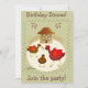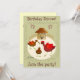 Ilustração de 3 galinhas jogando um verme no quintal. Atrás está a sua linda casa de galinha com uma cerca. Uma faixa de frango pé=impressões rodeia a imagem, e um aglomerado de ovos marrons decoram o cartão. Personalize sua mensagem na frente e no dentro.Interior: outro frango e uma faixa de impressões de pé adicionam charme ao seu convite.