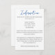 Apresentando nosso versátil cartão de casamento, a adição perfeita aos seus convites de casamento. Este cartão elegante oferece amplo espaço para você incluir detalhes essenciais para seus convidados, como acomodações de hotel, direções, opções de transporte, seu site de casamento e muito mais. Certifique-se de que seus convidados tenham todas as informações necessárias para celebrar seu dia especial com facilidade e estilo. Personalize o seu cartão de gabinete hoje e garanta uma experiência de casamento perfeita e memorável para todos!