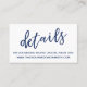 Mantenha seus convidados de casamento no loop com todos os seus detalhes com esses cartões de núpcias bonito e modernos. Uma camada de texto casual foi projetada usando uma fonte moderna escrita à mão em azul marinho, simplesmente lendo "detalhes". Use os campos modelo para personalizar essas placas de gabinete com suas informações pessoais. Uma placa maior também está disponível no conjunto, o que permite que você adicione mais informações do que esta pequena placa inclui. O fundo é branco e esta cor editável pode ser alterada para qualquer coisa da paleta de casamento que você escolher; todo o texto editável aparece no marinho. 90 //