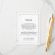 Este cartão de cerimônia de detalhes de casamento minimalista é perfeito para um casamento simples. A design romântica moderna apresenta a tipografia clássica, em preto e branco, emparelhada com uma caligrafia rústica, mas elegante, com estilo voltado para a mão. Personalizável em qualquer cor. Mantenha o design simples e elegante, como está, ou personalize-o adicionando seus próprios gráficos e trabalhos de arte.