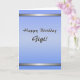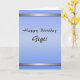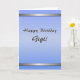 Cartão azul simples do inclinação com decoração de prata e as palavras "feliz aniversario Gigi!" O interior está vazio para a escrita seu próprio cumprimento pessoal.