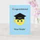 Cartão brilhante de Parabéns com chapéu de graduação e rosto feliz sobre fundo azul claro. Ideal para graduações. O texto pode ser personalizado!
