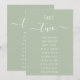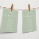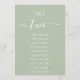 Na parte superior, há o número da mesa escrito em uma letra cursiva manuscrita e a palavra Mesa acima, em letras maiúsculas menores (letras manuscritas). Abaixo deles, estão os 10 nomes dos convidados, em letras manuscritas semelhantes. O fundo é verde sage, todo o texto é branco.