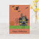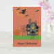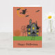 Cartão de Dia das Bruxas pintado de laranja com uma casa assustadora, uma bruxa, morcegos, fantasmas, e uma abóbora esmaecida. Design para crianças. Obrigados para Hungryjpeg e Creative Fabrica para alguns dos elementos do design.