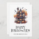 Belo cartão de Dia das Bruxas com uma bela casa assombrada, abóboras e morcegos. Personalize facilmente este cartão de Halloween com seu nome de família e texto.