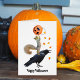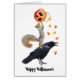 Um esquilo fica em um raven e derramares doces de um balde de jack-o-lanterno neste cartão de Dia das Bruxas da Vida Selvagem.