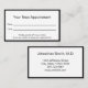 O cartão de médico profissional é duplo. Ambos os lados têm uma elegante borda negra. O lado um diz "Seu Próximo Compromisso" e tem linhas para a data e hora do compromisso. Na parte inferior, há texto de exibição que você pode editar para criar uma mensagem personalizada, se desejar. (Mostrado: Tenha gentilmente 24 horas de antecedência se não conseguir manter seu compromisso.) O lado dois tem texto a apresentar para substituir pelo nome do médico (ou nome da prática) e o endereço, número de telefone e sítio Web. Todo o texto pode ser editado ou excluído. O texto é preto.