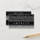 Incentivar os clientes a voltarem repetidamente com esses cartões de fidelidade de moda em padrões de chic de boho preto e branco. Excelente para dúzias, aulas de meditação, treinadores de vida, professores de ioga, terapeutas, salões e spas. Este design memorável apresenta um design ousado encorajando os clientes a se tornarem clientes leais. O verso é facilmente personalizado com a mensagem, o nome da empresa e as informações de contato. A modelo inclui marcadores de recompensa de fidelidade aos lacaios.