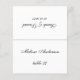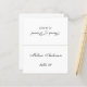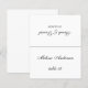 Um cartão de identificação de casamento preto e branco minimalista com o nome do convidado e o número da mesa impressos na parte frontal e os nomes dos noivos e a data do casamento impressos no lado oposto (isto é, a outra metade, antes de dobrar). Todo o texto está em caligrafia preta, o fundo é branco.