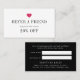 Encorajar os clientes a encaminhar os amigos com esses cartões de referência em preto e branco com um pop de cor-de-rosa fuchsia. Perfeito para salões, técnicos de unhas, maquiadores e boutiques, nosso design moderno e simples apresenta um coração cor-de-rosa quente com "consulte um amigo" e seu acordo de referência mostrado na frente (mostrado com "ambos receberão 20% de desconto"). Personalize o lado inverso com seus termos de referência, nome comercial, localização e informações de contato. Inclui espaço para os nomes do referenciador e do novo cliente.