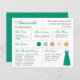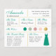 Um cartão de informação da madrinha para um casamento verde-esmeralda e ouro, incluindo informações sobre a data e a localização do casamento, as cores do casamento, a festa noiva, o vestido da madrinha e uma mensagem de proposta da madrinha. O nome da madrinha e os títulos estão escritos em uma escrita elegante verde. No canto inferior direito, há um vestido verde esmeralda. No centro, há as cores do casamento em círculos. As cores, incluindo a cor do vestido de noiva, podem ser alteradas, com exceção do círculo dourado, que é a folha de ouro falsa. As cores padrão são verdes, pinks e ouro. e ouro. A parte de trás é esmeralda verde, como a cor do vestido da dama de honra.